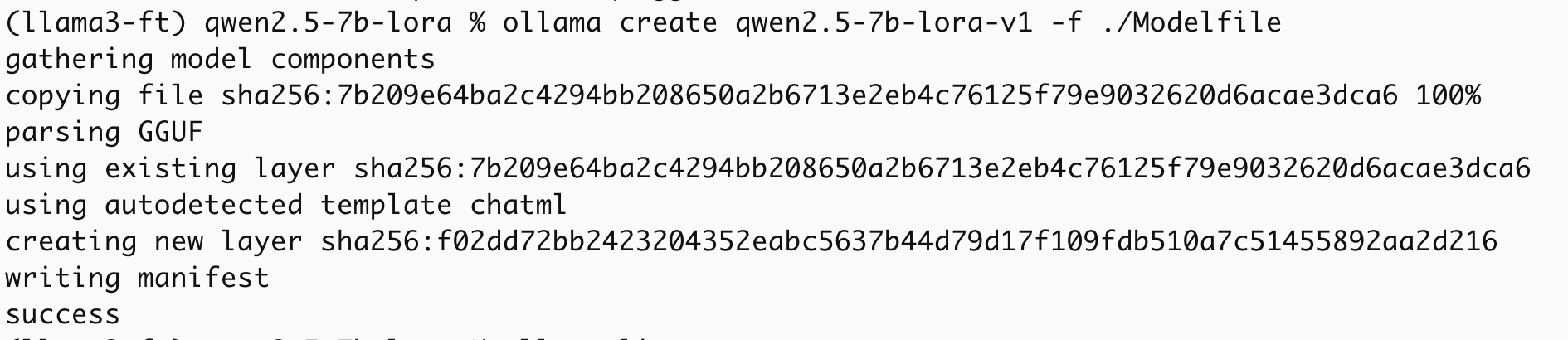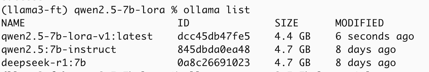 ollama create qwen2.5-7b-lora-v1 -f ./Modelfile