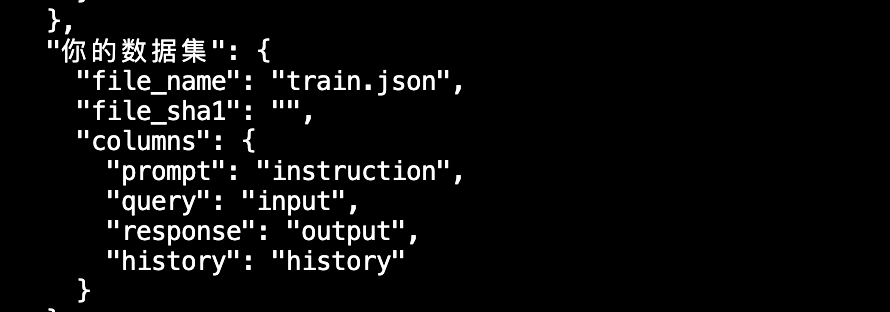 train.json到“你的数据集”,这个映射关系是通过如下这个dataset_info.json文件配置的。