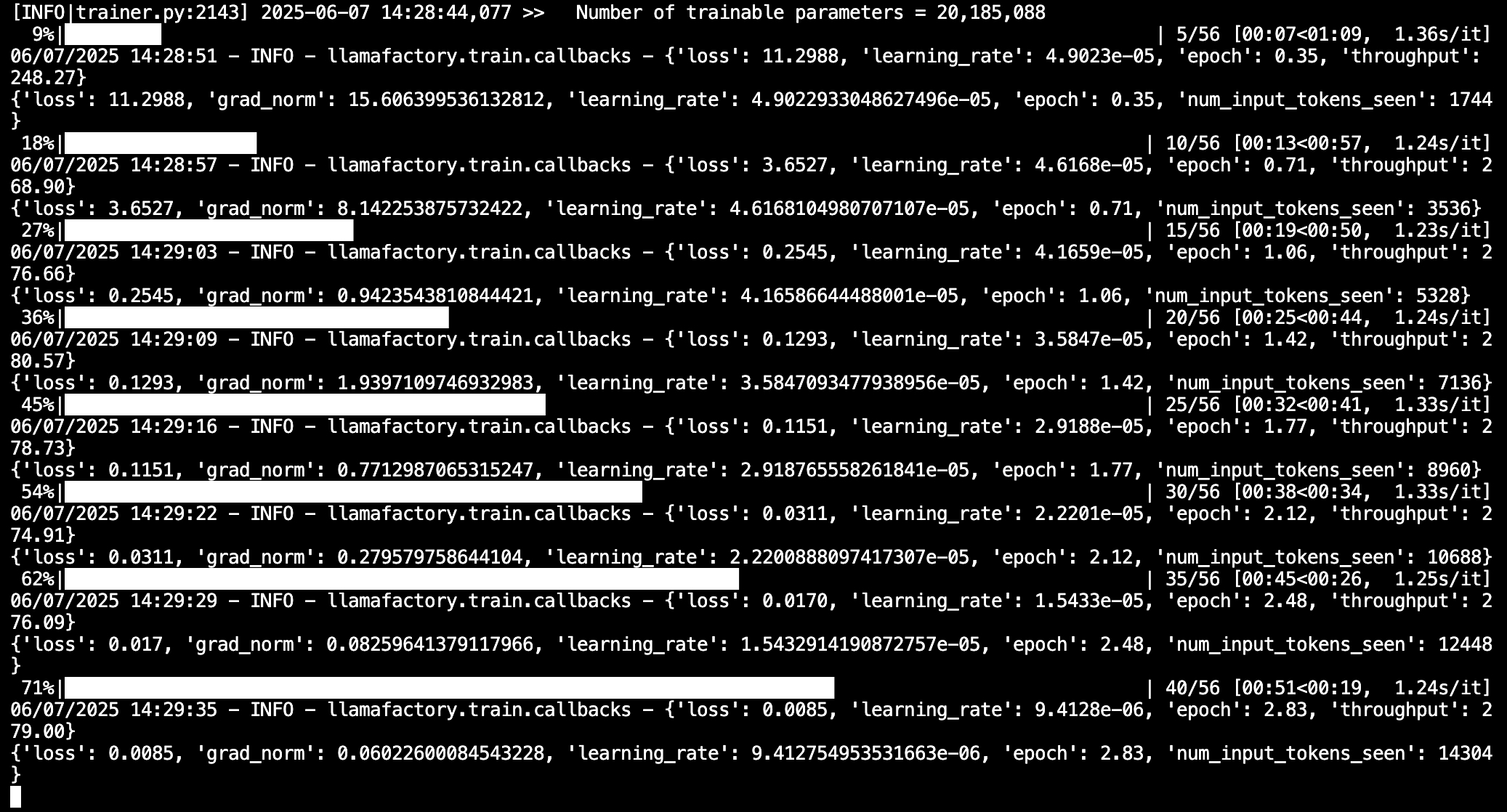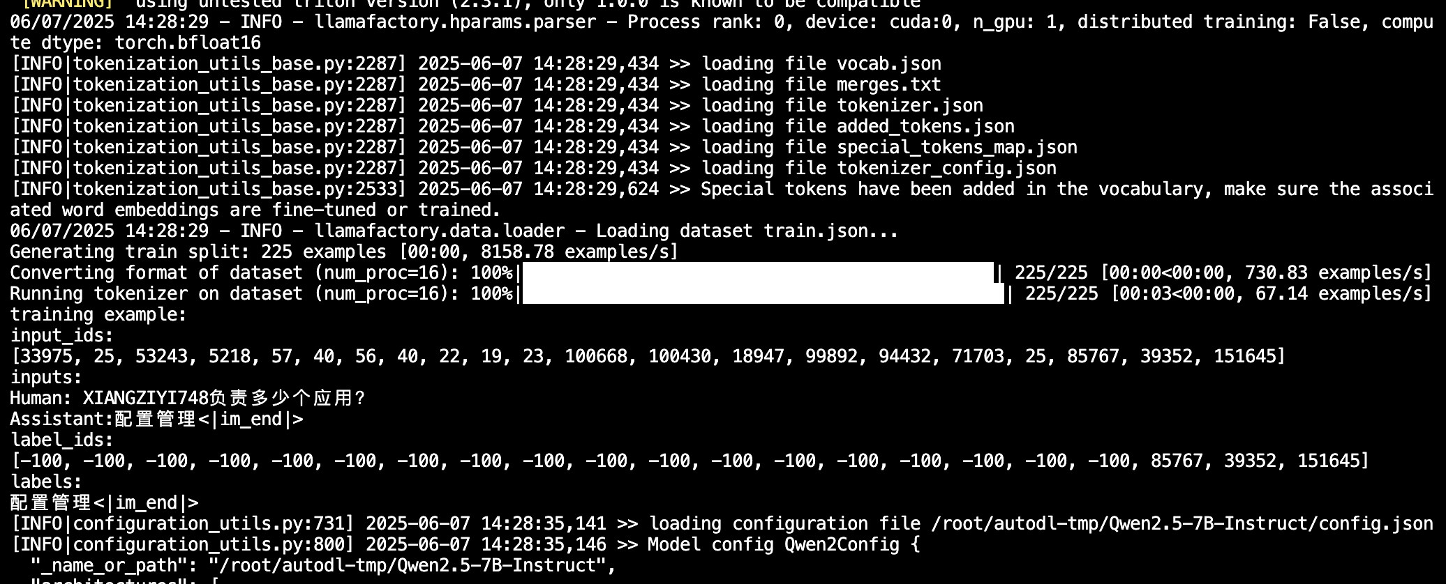可以看到,一共225条训练数据,微调过程只需要两分钟左右就完成了(14:28:29-->14:29:55)。