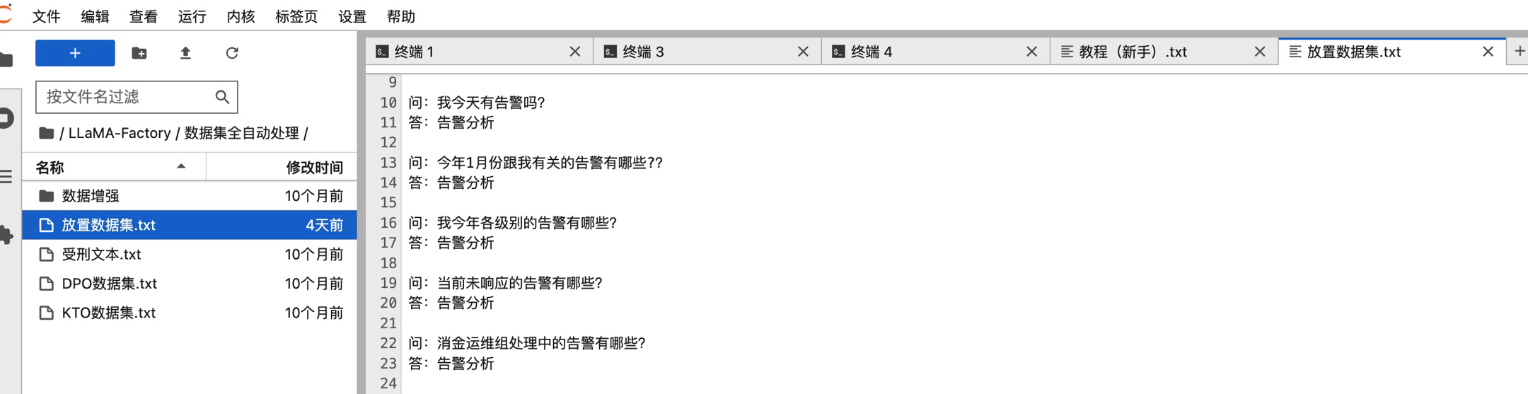 按照如下截图将微调数据集按照如下问答的格式粘贴到“放置数据集.txt”文件中