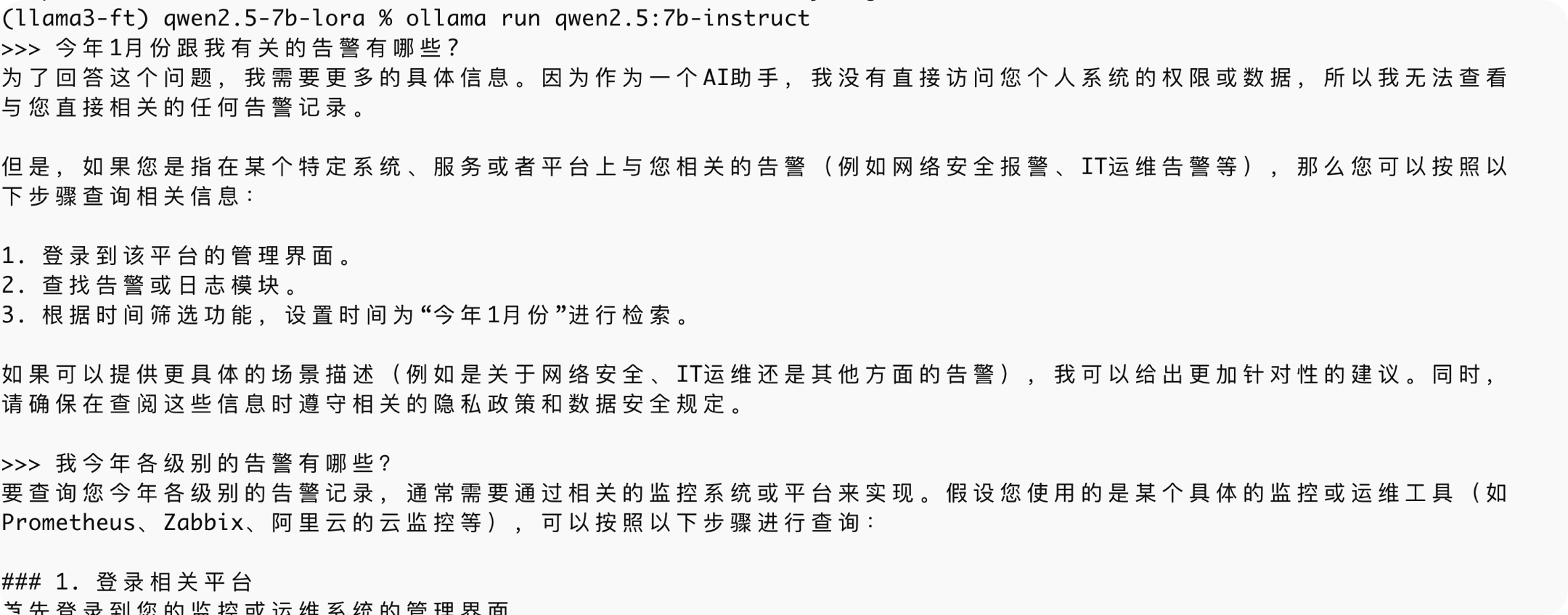 然后在ollama运行我们微调后的大模型,并验证问题。