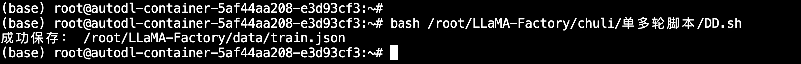 接下来,在终端中执行命令处理数据集,会自动将如上准备的问答数据集转存到训练格式的train.json文件中