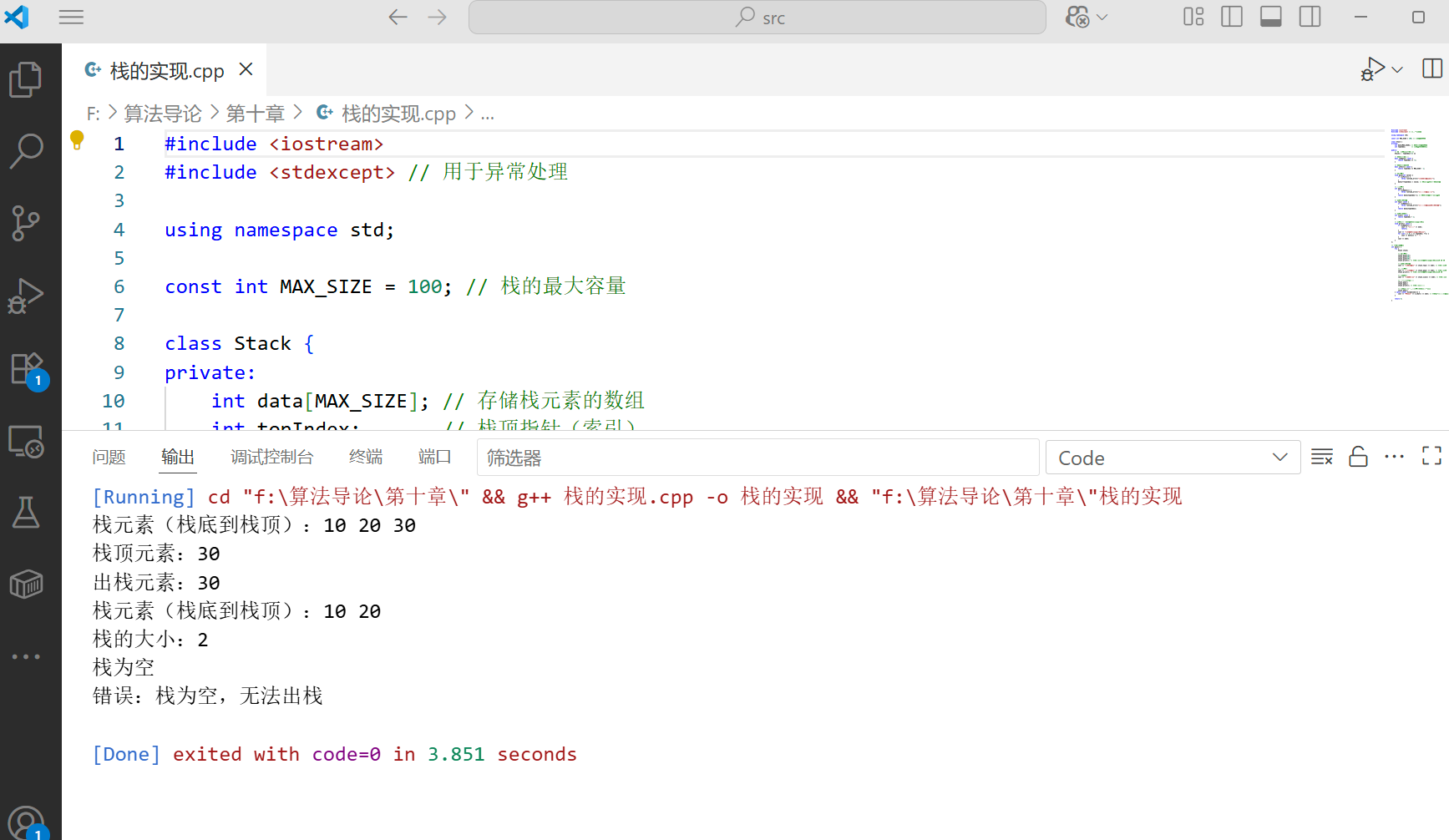cout << "出栈元素:" << stack.pop() << endl; // 应输出:30