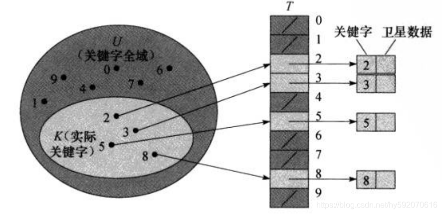 直接寻址表是一种简单的数据结构,当关键字的全域 U 比较小时,我们可以用一个数组(称为直接寻址表)来表示动态集合。数组的下标对应关键字,数组中的每个元素存储该关键字对应的卫星数据。
