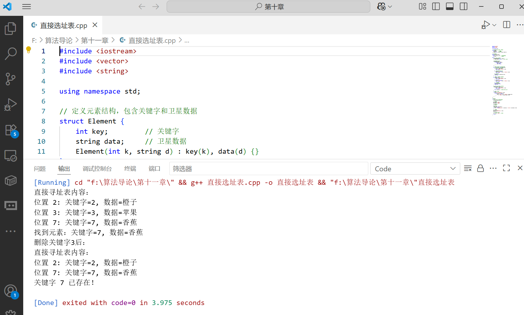 下面是直接寻址表的 C++ 实现,包含插入、删除和查找操作: