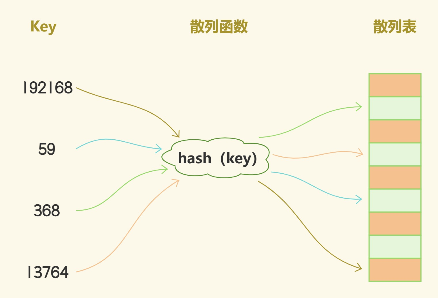 散列表(Hash Table)通过一个散列函数(Hash Function)h 将关键字 k 映射到散列表 T 中的位置 h (k)。这里的 h (k) 称为关键字 k 的散列值。