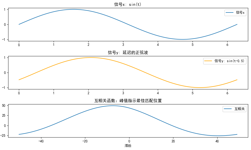 print(f"最大相关滞后: {lags[peak_index]} (应接近-5,因为y延迟了0.5)")