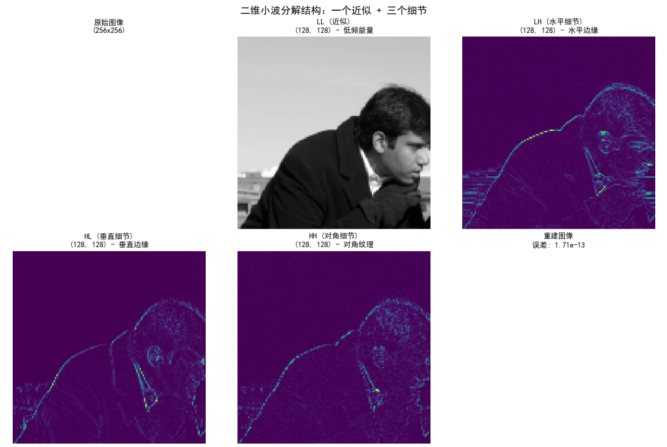 HH: 对角细节 → 纹理/噪声