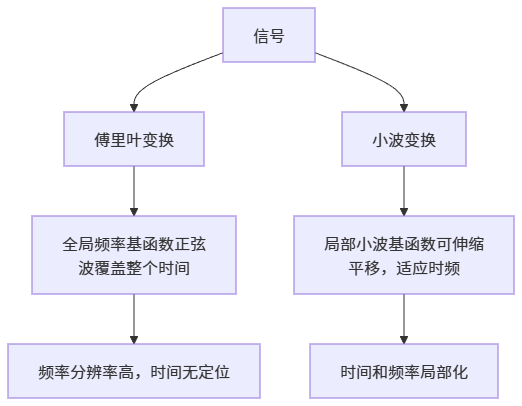 傅里叶变换使用正弦波作为基函数,但它们是全局的(覆盖整个时间轴)。小波变换使用局部化的基函数,能在时间-频率平面上灵活定位。