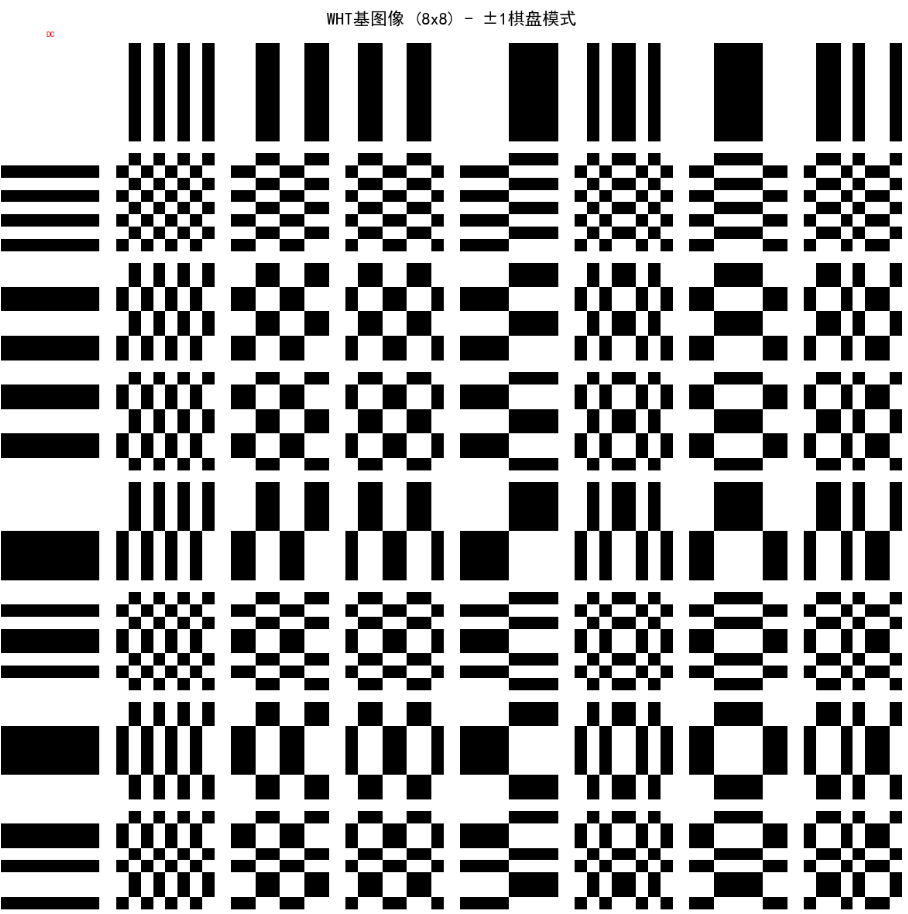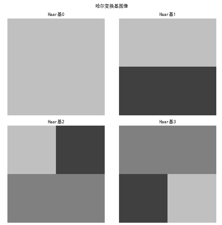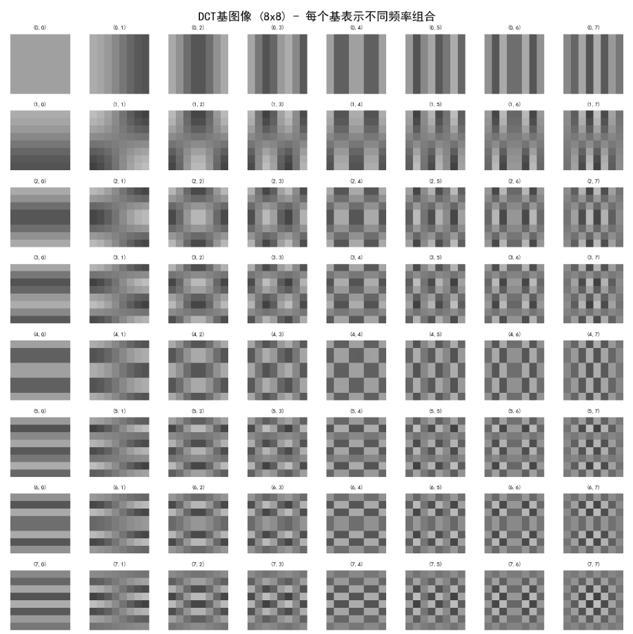 基图像是变换矩阵的列向量可视化。对于NxN图像,基图像显示每个基函数的形状。例如,DCT基图像从左上角(低频)到右下角(高频)变化。