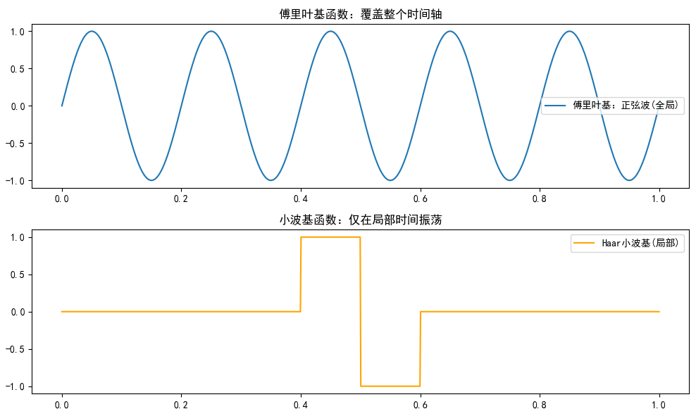 代码示例:绘制基函数对比 我们绘制正弦基和小波基(Haar小波)。