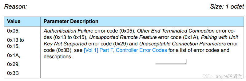 Reason参数表示结束连接的原因,会被复制到对应协议数据单元(PDU)的错误码字段中。在BR/EDR连接中,会被复制到 LMP_DETACH PDU 的错误码字段;而在BLE连接里,则会被复制到 LL_TERMINATE_IND 或 LL_CIS_TERMINATE_IND PDU 的错误码字段。