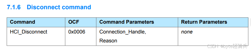 - OCF:表示具体的HCI命令。对于HCI_Disconnect命令,OCF的值是固定的,用于区分不同的Link Control命令。