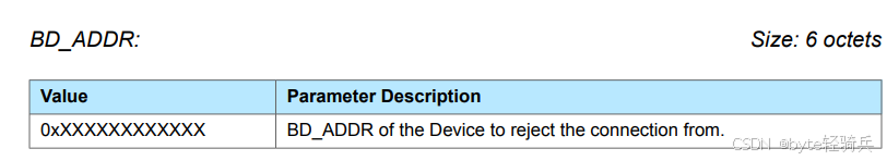 0 | 操作码(Opcode) | 2 | 用于标识命令类型,对于 HCI_Reject_Connection_Request 命令,其操作码固定为 0x000A,前一个字节为操作码组(OGF,一般为蓝牙规范定义的固定值),后一个字节为操作码命令(OCF,即具体命令的编号,这里对应此命令)。 |