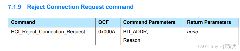 HCI_Reject_Connection_Request命令包含两个参数:BD_ADDR和Reason。