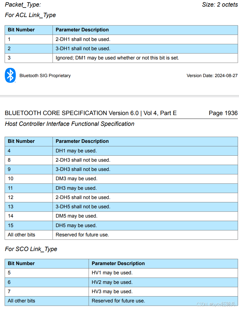 对于 SCO 链路类型,Packet_Type 参数只定义了其中的几位用于表示 SCO 数据包类型。