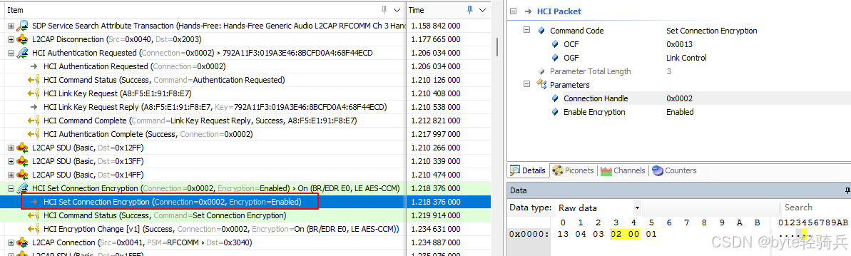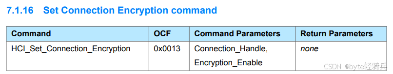 HCI_Set_Connection_Encryption命令格式 HCI_Set_Connection_Encryption命令遵循蓝牙HCI协议的数据包格式。