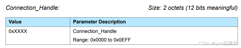 Connection_Handle 是一个2字节(16位)的字段,但其中只有12位是有意义的。意味着实际使用的值范围是从0x0000到0x0FFF,但由于只有12位有效,因此最高4位(即最高字节的高4位)不会被使用或应该被忽略,实际上有效的范围被限制在0x0000到0x0EFF之间。