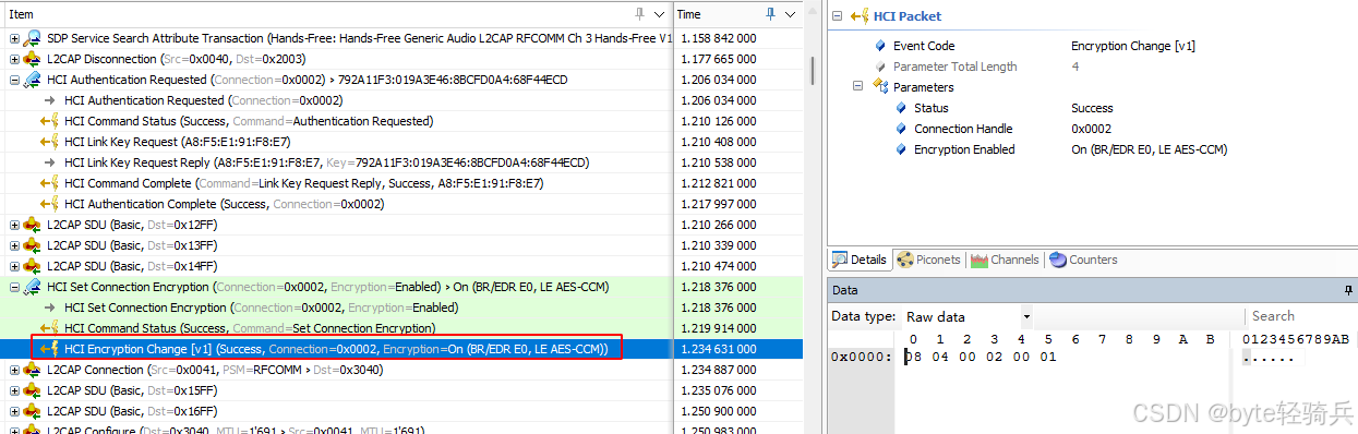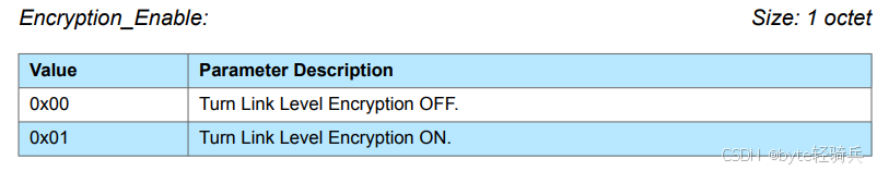 0x00:关闭链路层加密。表示在该连接上不会使用加密来保护传输的数据。0x01:启用链路层加密。表示在该连接上将使用加密来保护传输的数据,从而增加通信的安全性。请注意,启用加密通常要求两个蓝牙设备已经完成了配对过程,并且已经交换了必要的加密密钥。如果设备尚未配对,或者加密密钥不可用,尝试启用加密可能会导致连接失败或加密无法正确应用。
