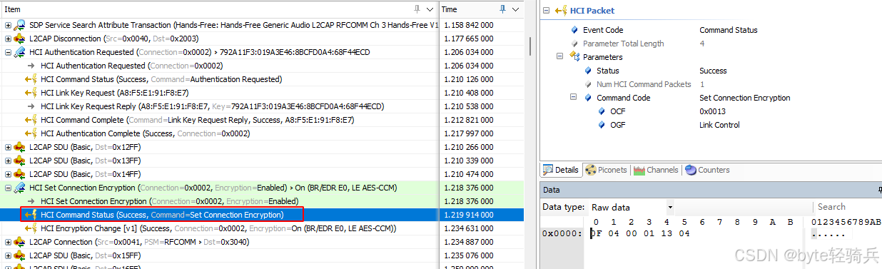 Encryption_Enable参数为0x01(开启加密)或0x00(关闭加密)。HCI_Set_Connection_Encryption。Encryption_Enable参数的格式和取值。Encryption_Enable为0x01时): Encryption_Enable为0x00时): HCI_Command_Status事件给主机,告知命令接收情况。HCI_Encryption_Change事件给主机,包含加密设置的最终结果。HCI_Encryption_Change事件。HCI_Command_Status事件,确认命令接收。HCI_Encryption_Change事件,根据加密状态的变化更新内部安全状态记录。下面提供一个简化的 C 语言代码示例,主要展示如何在主机端构建和发送 HCI 命令数据包,以及控制器端接收和处理该命令的基本框架。