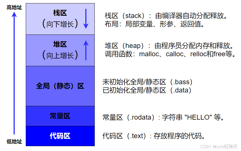 在嵌入式系统中,内存通常被划分为几个不同的区域,以满足程序运行的不同需求。这些区域包括栈(Stack)、堆(Heap)、全局/静态存储区等。