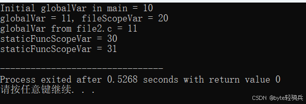 globalVar是一个全局变量,它在file1.c、file2.c和main.c中都是可见的。fileScopeVar是一个具有文件作用域的静态变量,它只在file1.c中可见。printStaticFuncScopeVar函数中的staticFuncScopeVar是一个静态局部变量,它只在printStaticFuncScopeVar函数内部可见,但其生命周期是整个程序运行期间。每次调用printStaticFuncScopeVar时,staticFuncScopeVar的值都会增加。