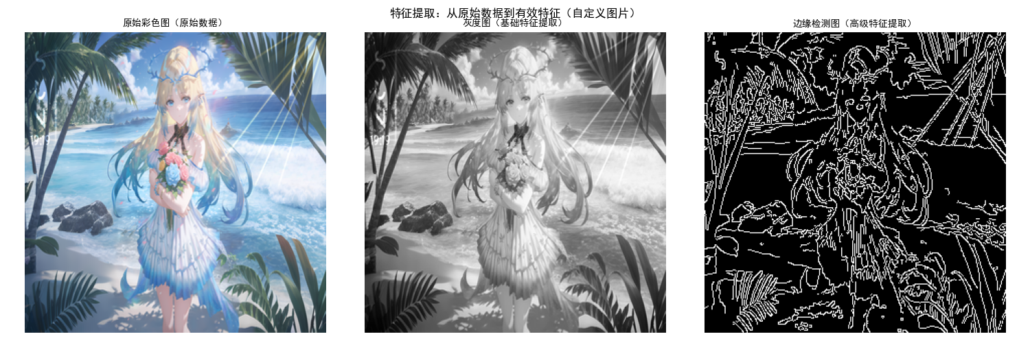 运行效果:展示三张图:原始彩色图(带蓝色矩形)→灰度图(简化特征)→边缘检测图(提取核心边缘特征),直观理解特征提取的核心是 “保留关键信息,简化数据”。