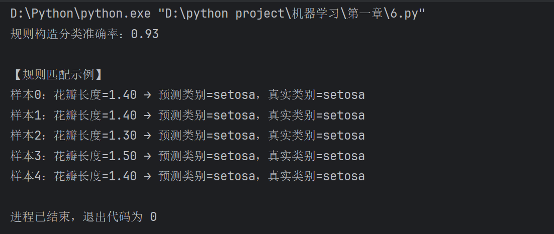 运行效果:控制台打印规则分类的准确率(约 0.95),以及前 5 个样本的规则匹配结果,理解 “规则构造” 是通过人工 / 自动方式制定决策逻辑。