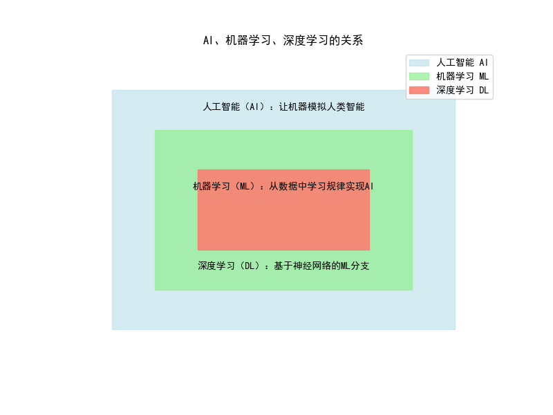 代码实现(AI/ML 概念可视化对比):用 matplotlib 绘制层级关系图,直观展示 AI、ML、深度学习的包含关系: