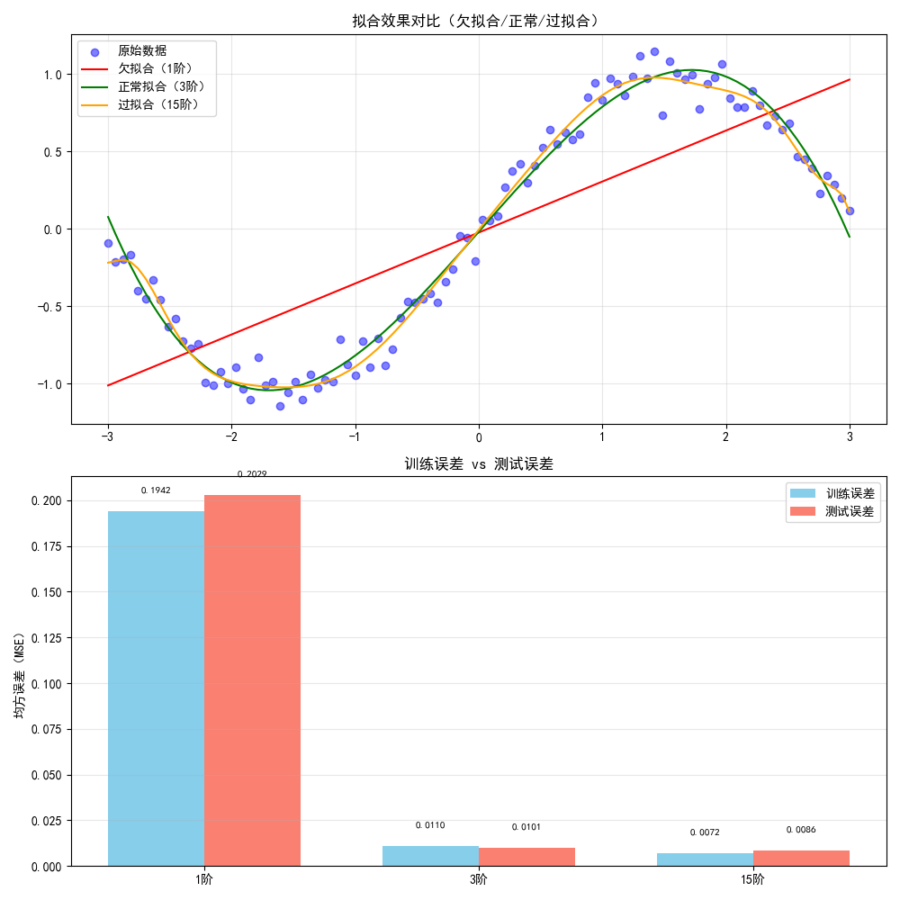 代码实现(误差对比可视化):用多项式回归演示欠拟合、正常、过拟合的误差对比: