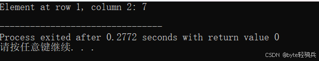 printf("Element at row 1, column 2 (via function): %d\n", element); // 输出: 7