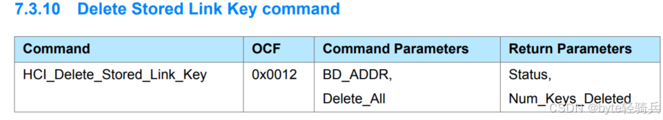 • 操作码(OCF):对于HCI_Delete_Stored_Link_Key命令,其操作码是固定的,用于标识该命令。