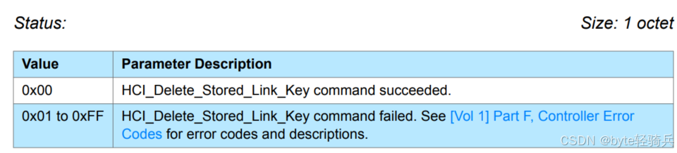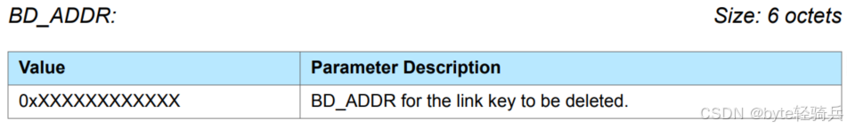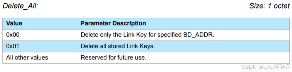 • 0x00:仅删除与指定 BD_ADDR 相关联的链路密钥。当此值被设置时,命令必须包含一个有效的 BD_ADDR 参数,该参数指定了要删除链路密钥的蓝牙设备。