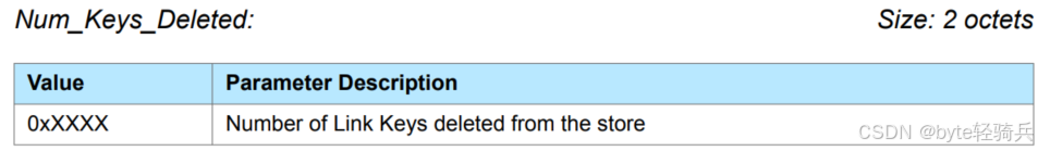 • 0x01:删除所有存储的链路密钥。当此值被设置时,BD_ADDR 参数将被忽略,因为命令将作用于所有存储的链路密钥。