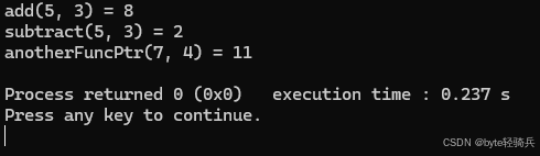 printf("anotherFuncPtr(7, 4) = %d\n", anotherFuncPtr(7, 4)); // 输出: anotherFuncPtr(7, 4) = 11