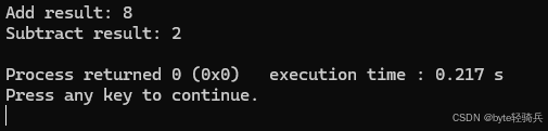 printf("subtract(5, 3) = %d\n", funcPtr(5, 3)); // 输出: subtract(5, 3) = 2