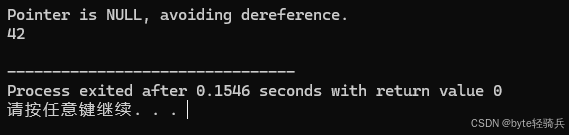 }首先初始化了一个指针ptr为NULL,并检查它是否为空。然后,动态分配了内存,并在分配成功后解引用了指针。最后,释放了动态分配的内存。