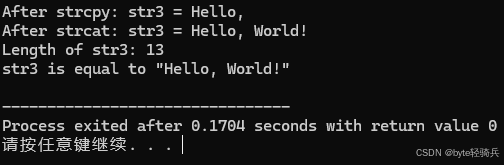 strcmp(const char *str1, const char *str2): 比较字符串 str1 和 str2。如果 str1 等于 str2,则返回0;如果 str1 小于 str2,则返回一个负数;如果 str1 大于 str2,则返回一个正数。以下是一个包含上述字符串处理函数使用的示例代码: