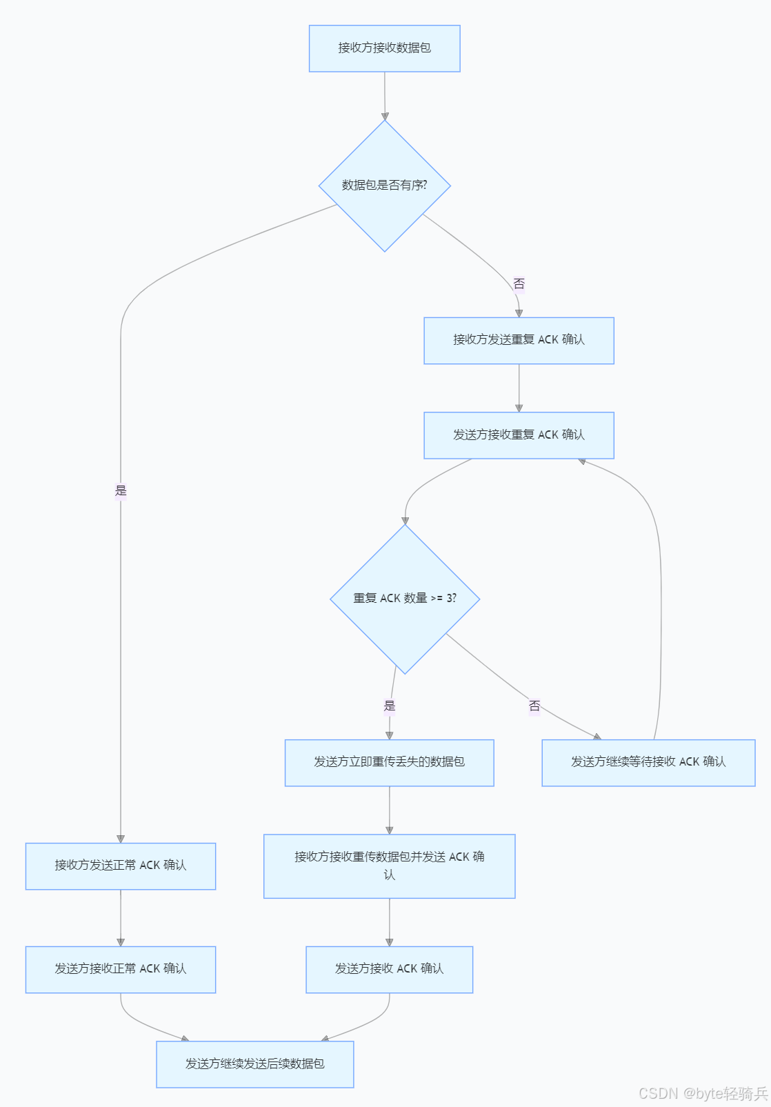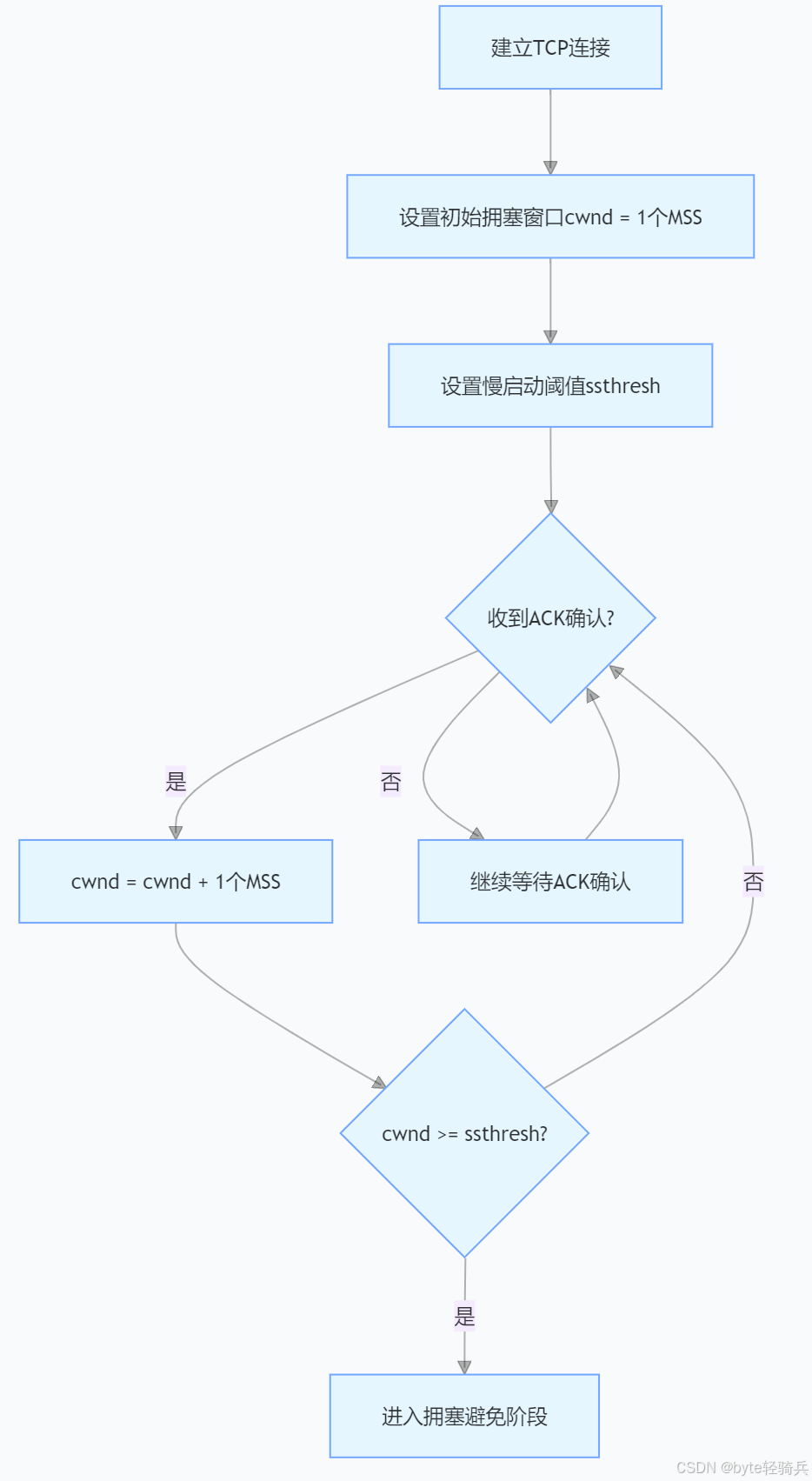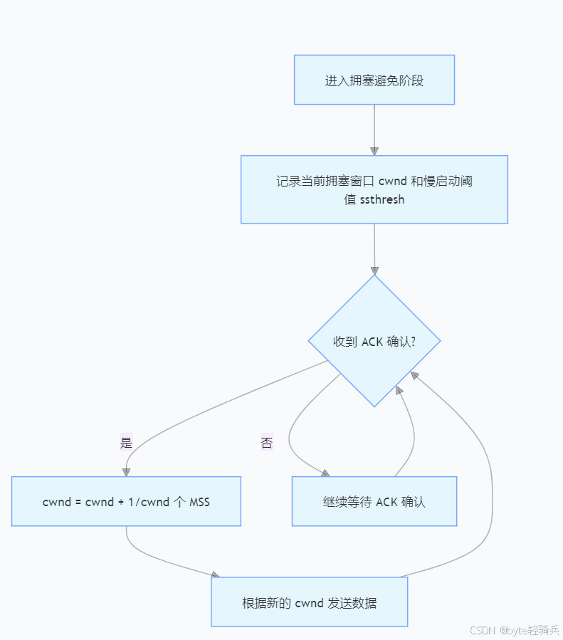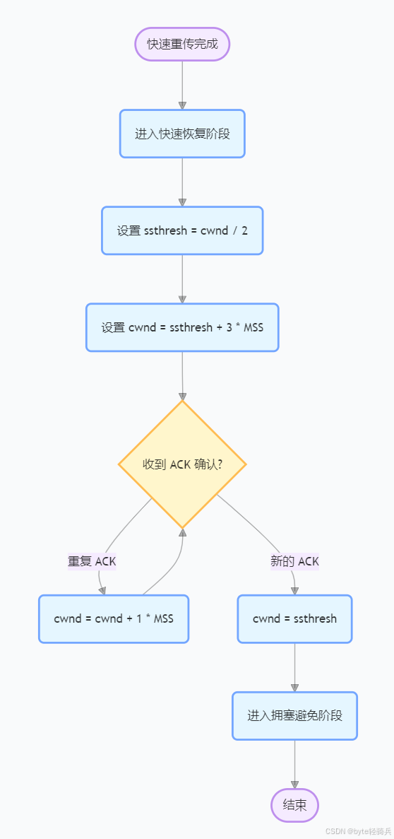 TCP拥塞控制主要通过四种算法来实现:慢启动(Slow Start)、拥塞避免(Congestion Avoidance)、快重传(Fast Retransmit)和快恢复(Fast Recovery)。