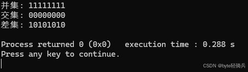 使用 bitset 表示两个集合 set1 和 set2,并进行了并集、交集和差集的运算。通过按位或操作 | 实现并集,按位与操作 & 实现交集,按位取反操作 ~ 和按位与操作实现差集。