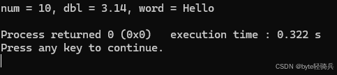 cout << "a = " << a << ", b = " << b << ", str = " << str << endl;依次将变量a、b和字符串str的值输出到控制台。