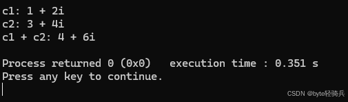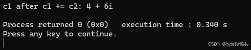 定义了一个 Complex 类,并重载了加法操作符 +。重载函数 operator+ 接受一个 const Complex& 类型的参数,表示另一个复数对象,返回一个新的 Complex 对象,其实部和虚部分别是两个复数对象实部和虚部的和。