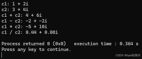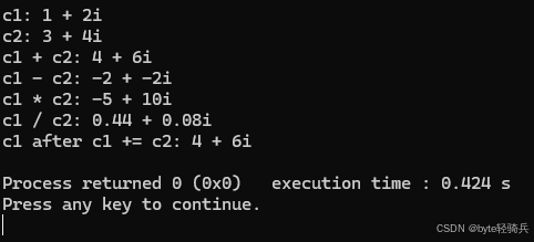 类似地,我们可以重载减法、乘法和除法操作符。以下是完整的 Complex 类代码,包含了所有这些操作符的重载:
