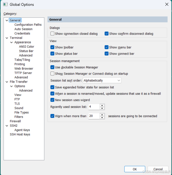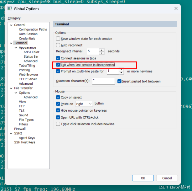 3.2 会话管理 自动关闭窗口 启用 Options → Global Options → Terminal → Close on disconnect ,断开连接后自动关闭会话窗口。