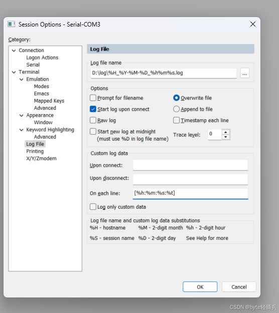 在 “会话选项” 对话框中,选择 “日志文件” 选项卡。勾选 “在每行日志的开头插入时间戳” 选项,然后可点击 “时间戳格式” 按钮,自定义时间戳的显示格式,如常见的 “% Y-% m-% d % H:% M:% S” 格式,表示年 - 月 - 日 时:分: 秒。设置完成后,在记录日志时,每行数据前都会显示对应的时间戳,方便对操作时间进行跟踪和分析。