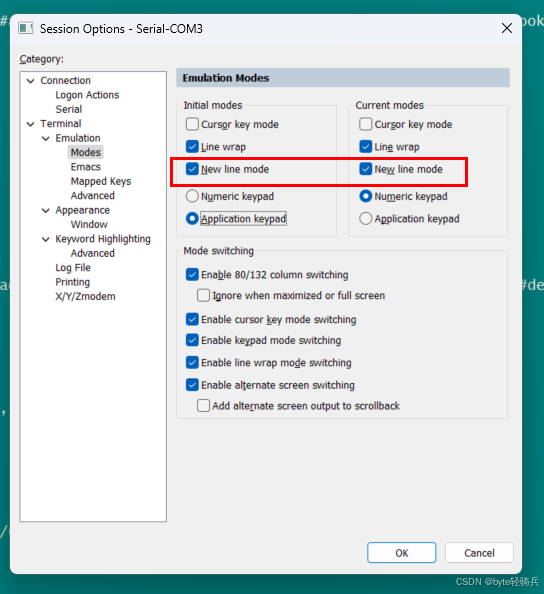 终端类型 :Session Options → Terminal → Emulation 选择 VT100 或 ANSI(兼容多数设备)。