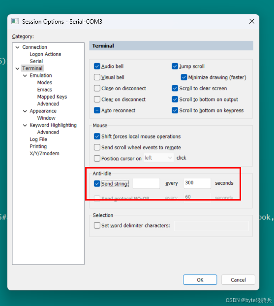 6.4 长时间无数据交互断连 启用保持连接 :Session Options → Terminal → Anti-idle 勾选 Send protocol NO-OP ,间隔设为 60 秒。