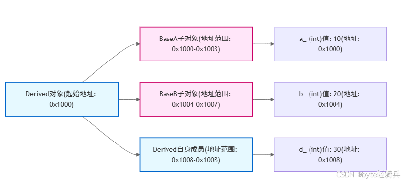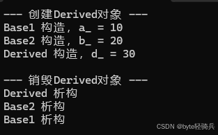 : Base1(a), Base2(b), d_(d) { // 基类初始化顺序由声明顺序决定(Base1→Base2)