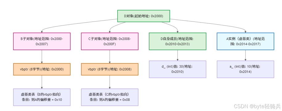 class D : public B, public C {}; // D继承B和C(此时B和C的A是同一实例)②虚继承的内存布局