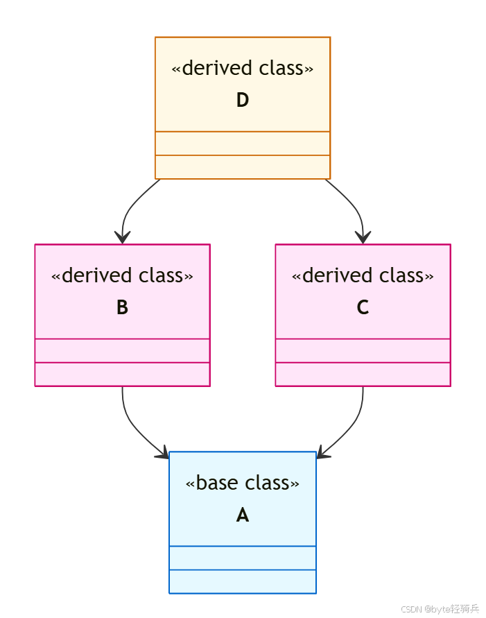 假设存在四个类:A是顶层基类,B和C都继承自A,D同时继承自B和C。类关系如下图 所示: